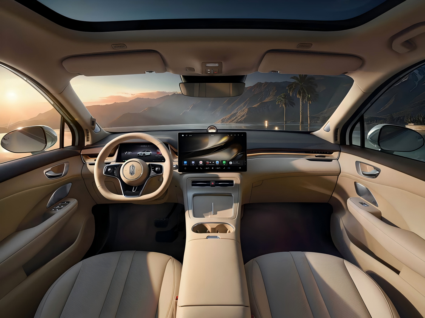 Chính thức, hình ảnh nội thất chính thức màu Shaohua Apricot cũng được tung ra đồng thời. Nó được kết hợp với vô lăng ba chấu đa chức năng, bộ khuếch tán vòng sao mang tính biểu tượng của dòng Harmony Intelligence Mobility, màn hình điều khiển trung tâm nổi và bảng điều khiển LCD đầy đủ, được kỳ vọng sẽ mang lại trải nghiệm thông minh tuyệt vời. Trong khi đó, lưng ghế trước nên trang bị giao diện Huawei MagLink, cho phép mở rộng các thiết bị ghế sau thông qua giá đỡ từ tính. Ngoài ra, dựa trên Harmony Cockpit, có thể thực hiện liên kết tương tác đa màn hình.